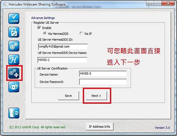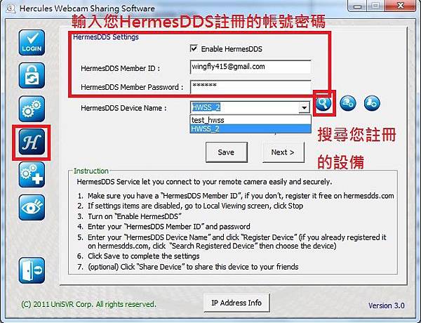 3.5 接著勾選Enable HermesDDS後,輸入您在HermesDDS註冊的帳號密碼,並且搜尋選擇您註冊的設備。